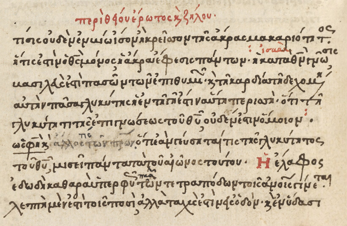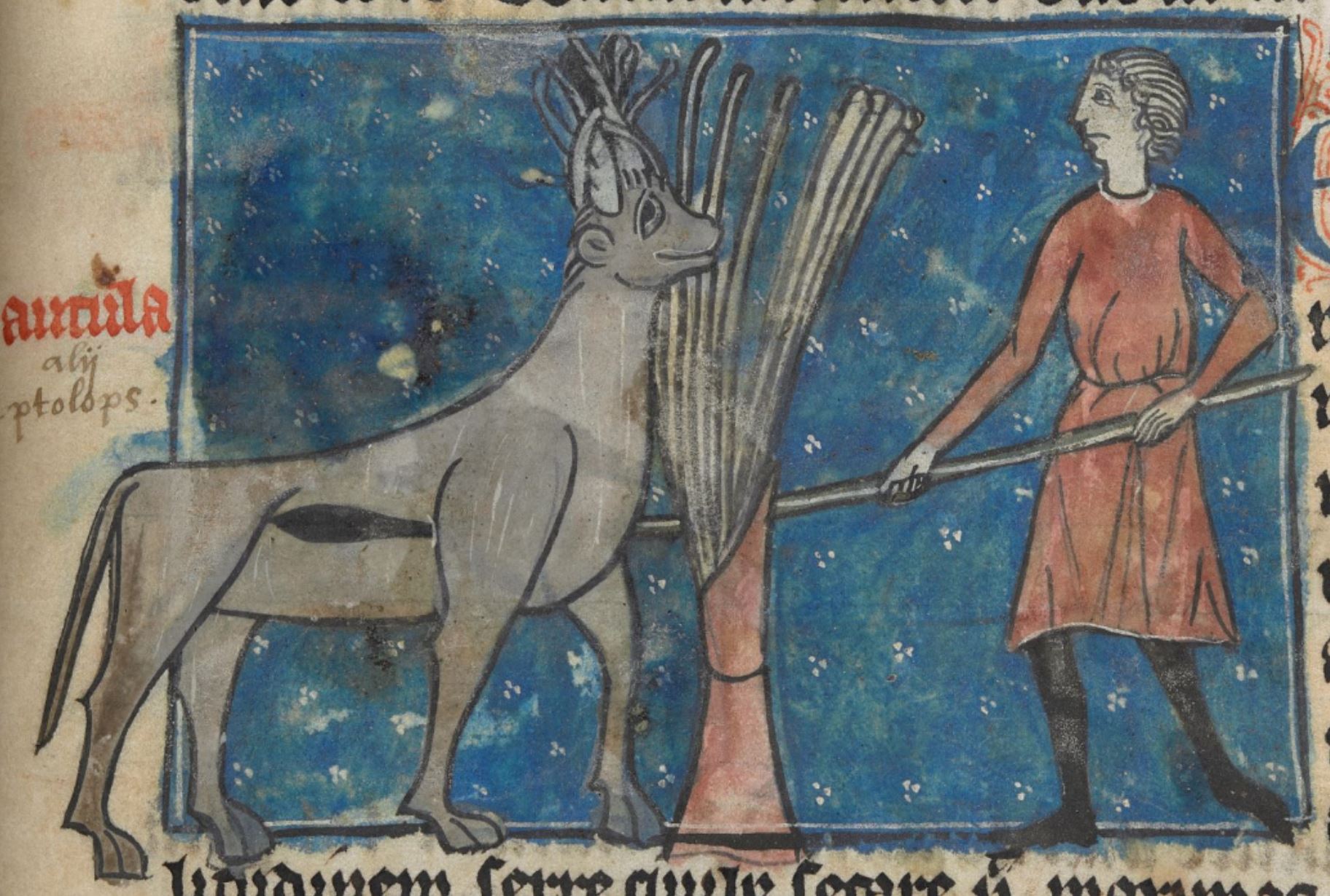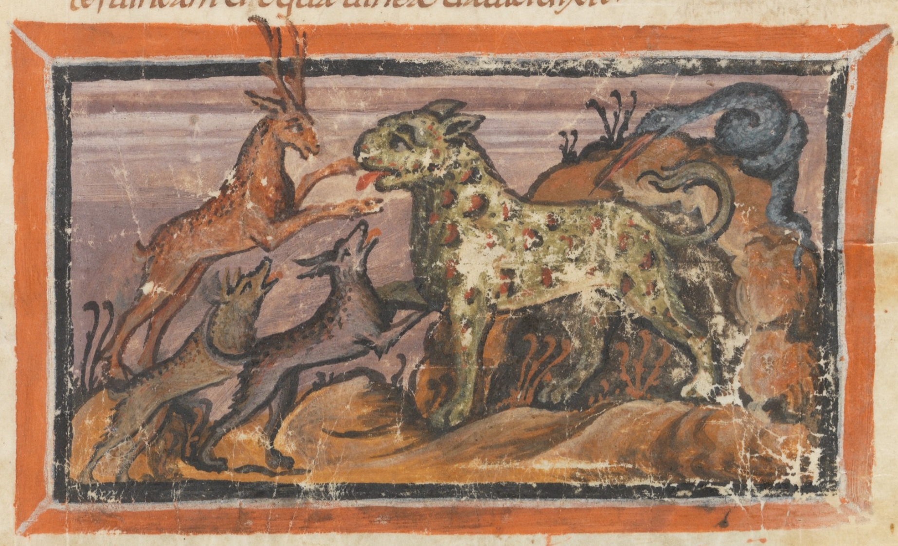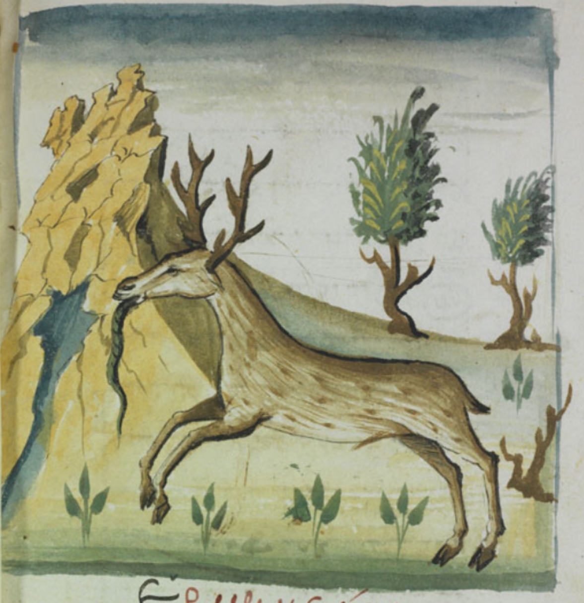 There is an animal called the antelope, so exceedingly alert that the hunter is unable to approach him. He has long horns in the shape of a saw so that he is able to cut through thick, high trees and fell them to the ground. If he is thirsty, however, he goes to the terrible Euphrates River and drinks. Near the river there are herecine (as they are called in Greek), that is, shrubs with thin branches; and he comes up to that herecine shrub frisking about and is ensnared in its branches. Then he cries out, wishing to escape, and is unable to do so for he has been ensnared. Hearing him, the hunter will come and slay him. O citizen whose commonwealth is heavenly [Phil 3:20], confiding in the two horns of might abstain from acts of slander and pleasure, inimical desire and the pomp of the world; the powers of the angels will rejoice for you, for the two horns are the two Testaments. But watch that you are not held by this most delicate herecine, that is, by the little shrub which covers you at just the right moment. Watch that you are not held in its snare, for the wicked hunter (that is, the devil) will slay you. The wise man, however, flees wine and women [cf. Ecclesiasticus 19: 2 and Hos. 4: 11].